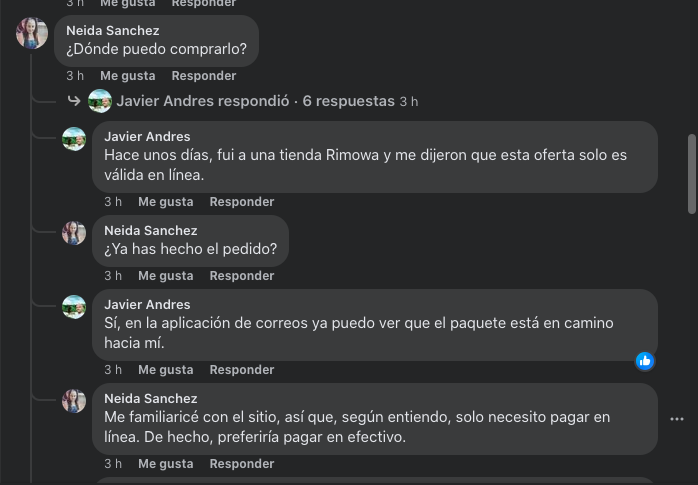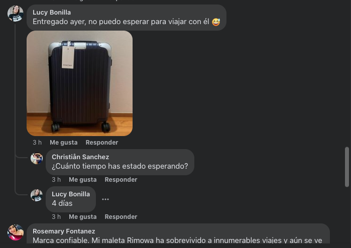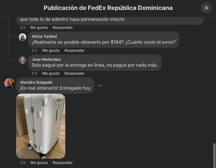 Lo que más me impresionó fue la dedicación que pusieron en crear una narrativa creíble. Las publicaciones están llenas de comentarios de personas que afirman haber recibido sus maletas, otros que las quieren y los que ya pidieron y están a la espera. La forma en que consiguen aumentar el FOMO (miedo a perderse la oportunidad) es sencillamente increíble. Llegan hasta el punto donde hay comentarios que te "enseñan" cómo conseguirlas, te hablan de la marca y hasta ponen fotos de las maletas que recibieron. Esta táctica, combinada con la repetición de la oferta por varias marcas, busca validar la estafa.
